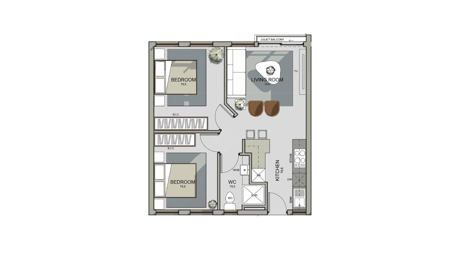 Although exactly the same size i.e 48sqm., you have the choice to choose between the mirror images of the unit each boasting a stylish kitchen, cozy lounge, two spacious bedrooms, and a shared bathroom.